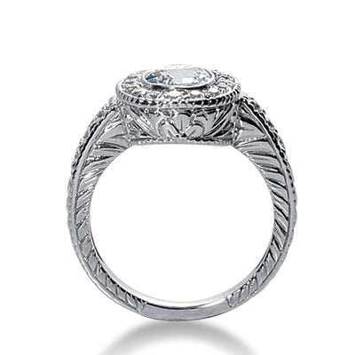 This bezel halo holds beautiful details in shining metal. An 8x6 oval diamond or gemstone will fit into this piece beautifully.