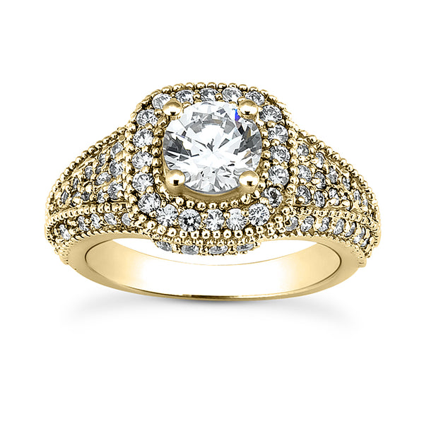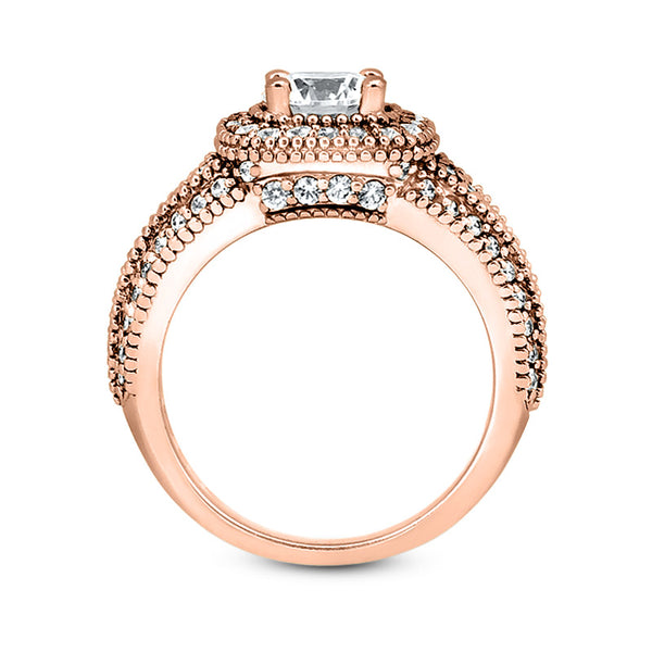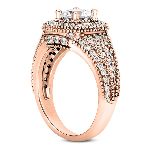 This radiant engagement ring can hold either a 1 carat round diamond or gemstone. Carat weight may be customized; available in White gold, Yellow gold & Rose gold. Center st...