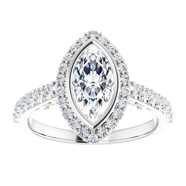 This sleek and romantic marquise-shaped ring can hold a 1-carat diamond or gemstone.