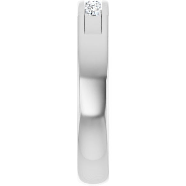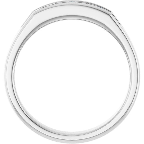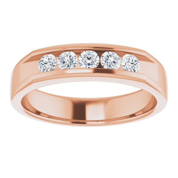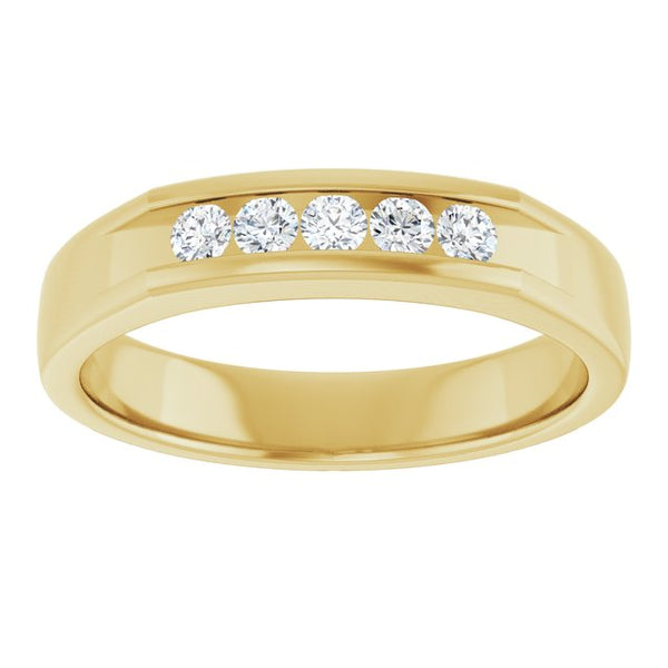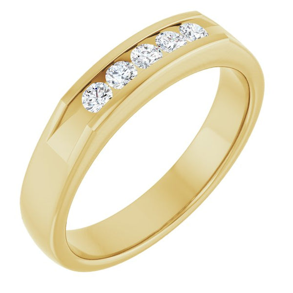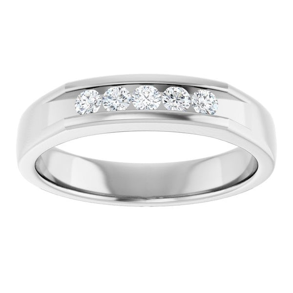 A sleek band with five channel-set diamonds. Each diamond measures 2.5 mm round, and they're G-H in color and SI2 - SI3 in clarity.